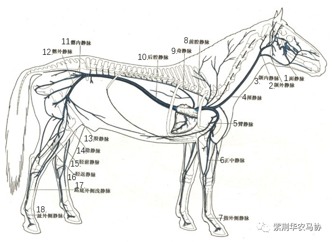 *补充:马因为无颈内静脉,称颈外静脉为颈静脉。颈外静脉位于颈静脉沟内,因其直接位于皮下而易触及,是临床上采血、放血、注射的主要静脉。