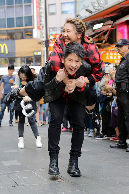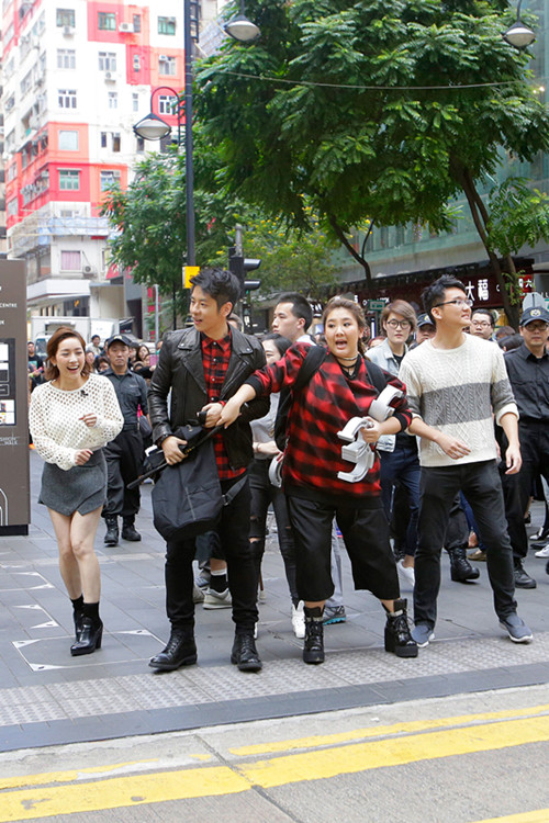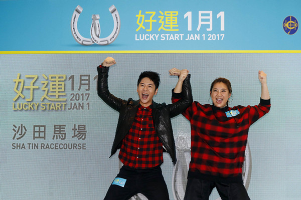 图十: 「好运孖宝」郑欣宜及许廷铿在铜锣湾走入人群中,率先与市民大玩游戏及呼吁市民参与《好运1月1赛马日》。