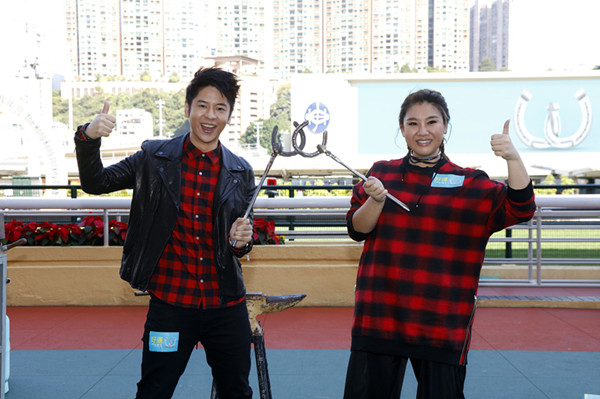 马会钉甲匠林奕祈向郑欣宜及许廷铿讲解马蹄?的打造过程。