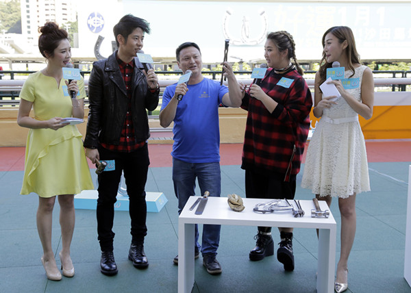 图3, 4, 5: 「好运孖宝」郑欣宜及许廷铿,联同两位「好运BB」麦美恩(Mayanne)及朱智贤(Ashley)出席当天的记者会,预告《好运1月1赛马日》沙田马场各项精彩活动。