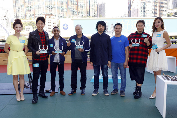 图7, 8: 一众出席嘉宾于记者会上大合照。左起:艺人麦美恩、歌手许廷铿、骑师田泰安、练马师苏伟贤、设计师黎启康、钉甲匠林奕祈、歌手郑欣宜及艺人朱智贤。