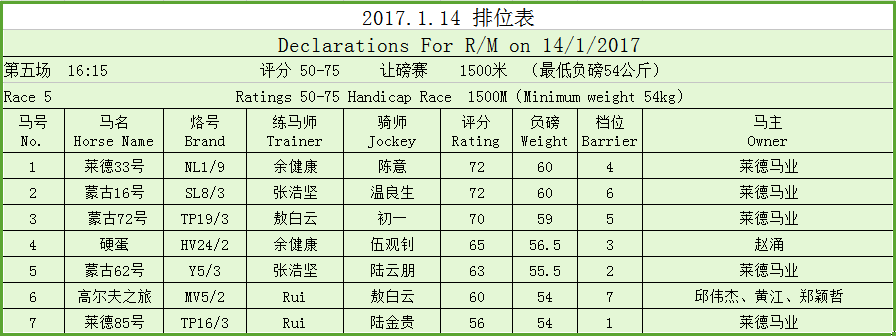 第一赛马网特派云南采编现场报道 明日(1月14日),2017中信莱德嘉丽泽速度马常规赛第三个赛马日再度来袭,当天共安排6场赛事,其中第二场为国产马大战,第四场为民族走马赛,第六场评分70分以上纯血马组1500米大战,令马友们十分期待。下面为大家带来最新一期排位表。