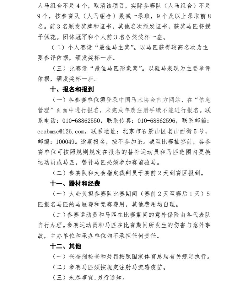 各有关参赛单位: 2017年全国马术三项赛锦标赛暨2017年十三运会马术项目三项赛资格赛(第一站)将于5月12日至14日在江苏海澜国际马术俱乐部举行。为使比赛顺利进行,现将赛事有关事宜通知如下: 一、报名 本次比赛报名请登录中国马术协会官方网站,在“信息管理”页面中进行注册和报名。所有报名单位及运动员须完成国家体育总局年度注册手续方可报名。报名截止时间为2017年5月8日,逾期报名,按不参加论。各队参赛运动员5月10日报到时须将赛事有效保险单发到赛事组委会。 二、报到 (一)报到时间: 各参赛代表队于5月10日到赛区报到。 (二)报到的所有费用由运动队自理,如需提前到赛区训练的队伍,务必于赛前6天与赛区联系,以便安排。 (三)报到时各代表队必须携带马匹护照并交验有效的马匹健康证明,必须遵守大会安排的训练时间和场地进行训练。 (四) 海澜国际马术俱乐部交通路线:沿S38常合高速向新桥方向行驶并进入新桥服务区/从新桥南收费站下高速/沿出口靠右行驶右转进入西环路/沿西环路行驶600米左右至红路灯路口左转进入新郁中路/沿新郁中路行驶600米左右至民乐广场(“国际花园城镇·新桥”楼牌建筑)雕塑处右转进入庄园路/沿庄园路继续行驶300米左右右转上大桥(友情提醒:桥面坡度较大)/直行即到达海澜飞马水城(原海澜国际马术俱乐部)。到达后由海澜飞马水城接待,请提前电话告知。 (五)运动队推荐酒店: 1.桃园山庄大酒店(五星级,俱乐部内) 地址:新桥镇南环路888号。 价格:标准间:488元/天(周日-周四),638元/天(周五、周六),。大床房:558元/天(周日-周四),738元/天(周五、周六),。 联系人:营销部 张梅梅 (15106160565) 2. 海澜大酒店(五星级,距离俱乐部10分钟车程) 地址:江苏省江阴市新桥镇陶新路8号。 价格:标准间:270元/天,大床房:350元/天。 联系人:营销部,徐洁(13806163341) 3. 海澜商务楼(商务酒店,距离俱乐部10分钟车程) 地址:江苏省江阴市新桥镇陶新路8号。 价格:豪华标准间:129元/天,豪华大床房:139元/天。 普通标准间:99元/天,普通大床房:109元/天 联系人:营销部,徐洁(13806163341) 以上价格为团体价格,建议各运动队及工作人员订房时,说明是参加2017年全国马术三项赛锦标赛暨2017年十三运会马术项目三项赛资格赛(第一站)的相关人员。 三、有关收费标准 (一)马厩费:大会负担参赛队比赛期间(赛前2 天至赛后1 天)5匹报名马匹的马厩费,超出部分各参赛运动队自理。 100元/马/天(不含饲料费)。 (二)伙食费:各参赛运动队自理。 (三)承办单位可提供马料,收费标准为: 苜蓿草:4.0元/公斤 青干草:4.0元/公斤 稻壳:15元/包 四、检验检疫 根据竞赛规程规定,各参赛运动队的参赛马匹须按规定注射注射马流感疫苗,以保障本次比赛顺利进行。承办单位将协助各参赛运动队办理及开具检验检疫证明。 五、联系方式 (一)自剑中心马术部 联系人:范珩 电 话:010-68862550 传 真:010-68862596 (二)运动队报名联系人: 联系人:靳彤琳 电 话:18611668659 邮 箱:ceacppx@126.com (三)运动队报到联系人: 联系人:宋婷 电 话:15061551571 中国马术协会 2017年4月24日