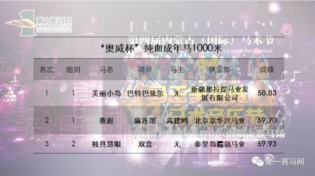 关键看 “奥威杯”纯血成年马1000米由于参赛马匹过多,分成两组比赛。因此每组的头马不一定就是最终比赛的冠军,需要根据具体时间一绝胜负! 第一场比赛非常精彩! 4岁“美丽小岛”舒服紧贴内栏,望空度势。内栏已满,“赛彪”难进,被逼外栏加速。“美丽小岛”一两鞭“放”着“赛彪”,“赛彪”后劲不足,“美丽小岛”认真加速,50-60米夺冠。8岁骟马“赛彪”第二。第三“奥威福迪”公马气势逼人,需两人牵之亮相! 第二场,白汗淋漓的“独具慧眼”一路领放,“吉人天相”原有机会,可惜大弯路过早使力,包抄冲刺失败,力气耗尽。位处第三的“狂野”得了“便宜”,直路发力,拿下第二。“蒙骏荣誉”紧贴内栏加鞭发力,低调得季。 “汇森科技杯”国产马(1.4米以下)1000米