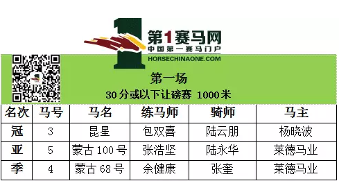 第一场安排的是30分或以下让磅赛,途程1000米,赛前因“龙骑士”退赛,所以只有七匹马角逐。最终,“昆星”在骑师陆云朋驾驭下拿下首金,“蒙古100号”收获第二,“蒙古68号”摘得第三。