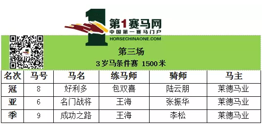 第三场是3岁马条件赛,途程1500米,本场最高负重58公斤的两驹“好利多”、“名门战将”占据冠亚两席,第三名由“成功之路”拿下。