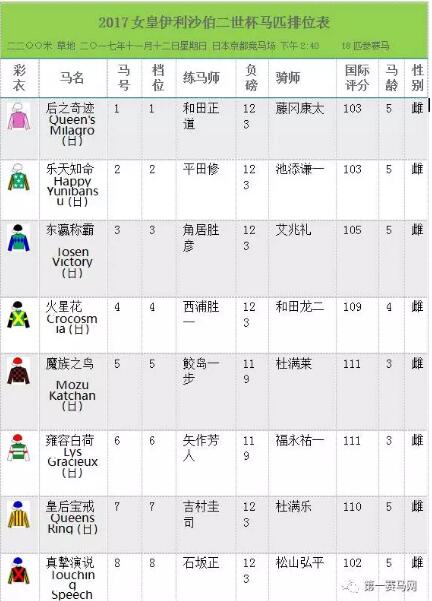 据悉, “皇后宝戒” 本季三战皆输。该驹5月在维多利亚一哩赛(一级赛)中跑第六名,上战角逐府中牝马锦标(1800米二级赛),慢闸情况下跑获殿军。不过该驹适应能力较强,任何场地都能发挥出应有水平,它尤其喜跑京都竞马场。