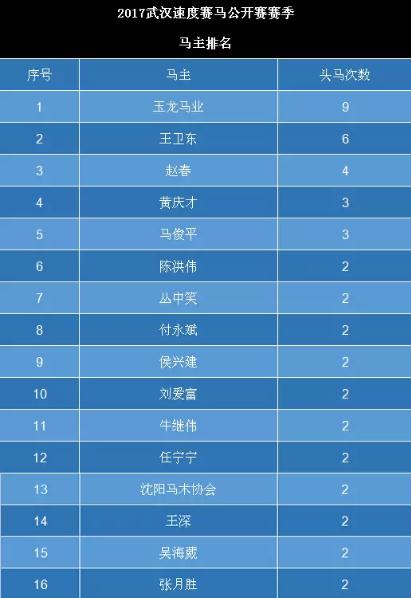 而引人关注的马主方面,目前玉龙马业以9个头马位列魁位,马主王卫东、马主赵春分别以6个头马和4个头马位列其后。