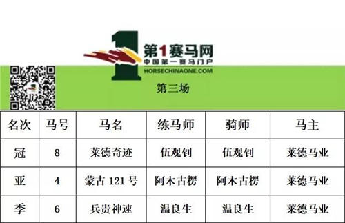 开闸后,3号马“幸运星”在骑师黎加飞的策骑下,抢先发力,很顺利的跑在了领放位置。“马-世铭”见“幸运星”的发力,很是不甘心。俗话说“老马有火,非同小可”更何况是身处赛马黄金期的“马-世铭”呢。“马-世铭”在骑师张振华的策骑下。像踩了一脚油门般,速度迅速提了上来,与“幸运星”也是形成一个并驾齐驱之势。即使在弯道过程中,两匹赛驹依旧你追我赶,速度节奏牢牢的把控在其中。在最后的冲刺时,“幸运星”再次将压力化为强大的动力,提速前行。以一个微弱的优势拿下了赛事的桂冠。而“马-世铭”则拿下了赛事的亚军名次。季军被2号赛驹“永利”拿夺。“永利”的后程发力也是非常漂亮。