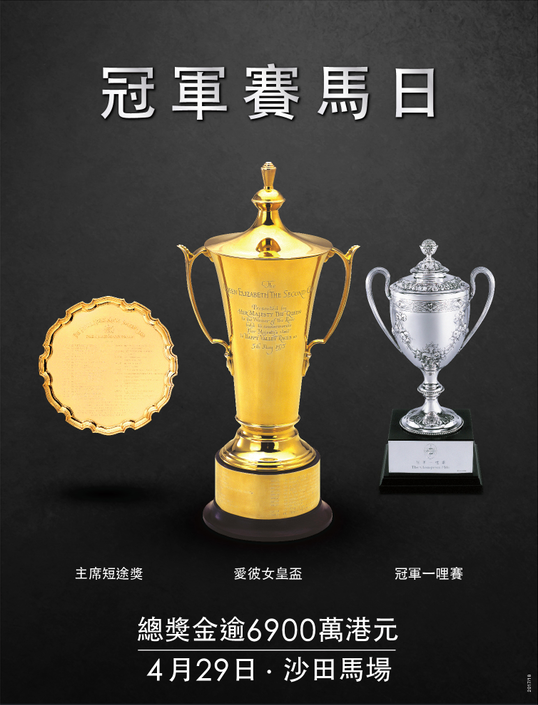 上述三项大赛均名列全球百大一级赛之内,香港马会今年首次编排于同一日举行,精彩可期。奖金方面,爱彼女皇杯的总奖金为二千四百万港元;冠军一哩赛总奖金一千八百万港元;主席短途奖的总奖金则为一千六百万港元。