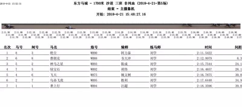 “垄上行”再次出赛,未战先热,出闸先占前位。“飞天”“绿宝石”及“垄上行”封锁内栏,三马于前列缠斗至1000米处,后“垄上行”及“飞天”逐渐力竭,慢慢落至第二集团,800米后由骑师阿力泰见前路空出,随即挥鞭而上,策骑“绝尘”与弯道而上,一路领先直至终点。“普朗克”喜获亚军,“神马之星”位列第三。