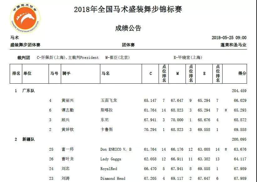 开赛首日进行的是圣乔治科目团体赛的比赛。圣乔治科目是全运会、全国锦标赛等国内最高级别舞步比赛所采用的科目之一,科目中包括定后肢旋转、斜横步、空中换腿等一系列较高难度的特定动作。比赛中需要骑手与马匹默契配合,以使整个过程动作精准流畅,姿态优美从容。本场比赛比赛采用国际马联颁布的第25版国际马术盛装舞步竞赛规则。共设E、C、M三个裁判点,以三个裁判点评分的百分数计算骑手得分。团体赛将同队前3名的骑手的成绩相加,累计得分高者名次列前。最终,经过6个小时的比拼,广东队如愿以偿地获得冠军,新疆队取得亚军,江苏队位居季军。