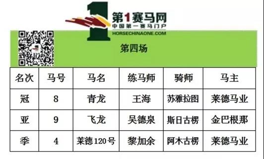 第四场赛事,同样是五班马千米平磅赛,与第三场相较这场出战马匹亮点不多,素质均衡,这就导致很难预测赛果。不过8号马“青龙”还是让人眼前一亮,虽然中途险被4号马“莱德120号”反超,但最终还是以微弱优势率先冲线。