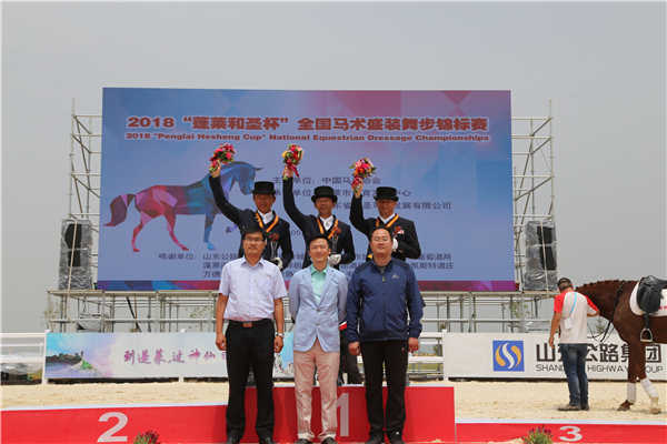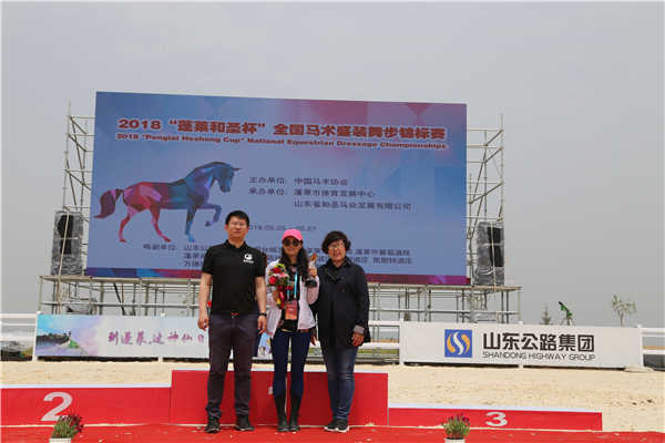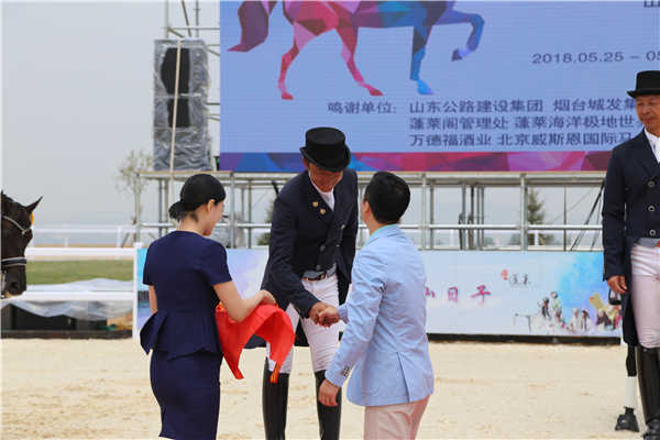 颁奖仪式上,中国马术协会业务负责人钟国伟、蓬莱市体育发展中心副主任王瑾庆和大辛店镇党委委员李富民分别给获奖者颁发奖牌、奖杯和鲜花。广东队的领队于海燕女士领取了由蓬莱和圣农业技术开发有限公司总经理李桂莲、蓬莱和圣农业技术开发有限公司副总经理范黎仲颁发的最佳马主奖的奖杯和鲜花。