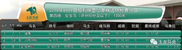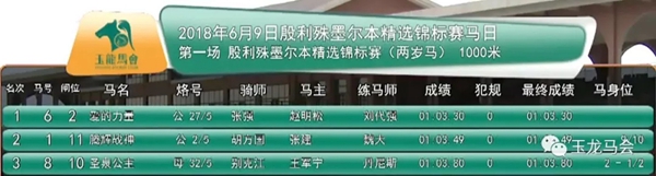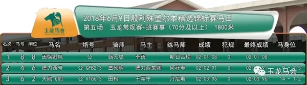——玉龙国际赛马公开赛2018—— 第4赛事日战报 第1场 殷利殊墨尔本精选锦标赛(两岁马) 途程:1000米 奖金:10万元 冠军:“爱的力量” 马主:赵明松 骑师:张强 本场颁奖嘉宾:澳大利亚殷利殊赛马拍卖行 赛马顾问 田劲 第2场 玉龙常规赛三班赛事 (57-75分) 途程:1000米 奖金:7万元 冠军:“心花怒放” 马主:王军宁 骑师:王伍美 本场颁奖嘉宾:陕西勇强马术俱乐部 董事长 李勇 第3场 三岁马 途程:1000米 奖金:5万元 冠军:“鹰击长空” 马主:王军宁 骑师:王伍美 本场颁奖嘉宾:北方集团、辽宁跃龙赛马俱乐部 董事长 陈洪伟 第4场 处女马(评分50分及以下) 途程:1200米 奖金:5万元 冠军:“猛禽” 马主:侯兴建 骑师:覃朝辉 本场颁奖嘉宾:天津华宇集团、华宇赛马俱乐部 董事长 黄庆才 第5场 玉龙常规赛二+班赛事(70分及以上) 途程:1800米 奖金:10万元 冠军:“勇强追风” 马主:李勇 骑师:魏云忠 本场颁奖嘉宾:北京天赐圣泉集团、天赐圣泉赛马俱乐部 董事长 王军宁