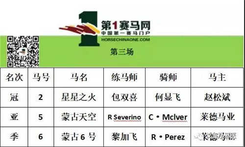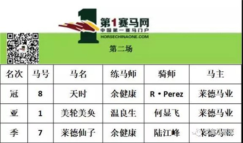 第二场赛事,8号马“天时”出闸之后立即领放全场,直达终点,1号马“美轮美奂”制图超越,但无奈状态不佳,只得第二,第三则被“莱德仙子”揽入怀中。这场比赛“天时”以多马位优势率先冲线,可谓精彩!