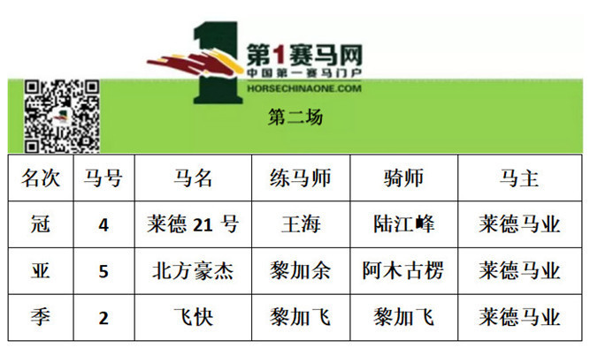第二场,四班马千米途程让磅赛。2号“飞快”在“马王”黎加飞的策骑下在前半段迅速建立优势,虽然处于7号这个比较中间的闸位,但是开闸之后他便迅速靠近内栏冲出。骑师黎加飞的策骑战略真的是不浪费一丝一毫的机会,由始至终紧贴内栏向前急奔。但是就在进入弯道的时候,4号“莱德21号”5号“北方豪杰”借机贴上,试图从外栏超越,毕竟紧贴内栏的2号“飞快”在骑师黎加飞的策骑下丝毫没有给对手从内栏借机超越的机会,哪怕是到了最后的直道冲刺,想从内栏超越的3号“勇斗士”也只能无奈的跟在其后。进入最后的直道冲刺时,4号“莱德21号”稍有外闪,观众也是为骑师陆江峰捏了一把冷汗。但强大的心理素质和优秀的策骑能力,让骑师陆江峰与4号“莱德21号”瞬间将状态转回,并从外栏奋起直追。最后离终点已无多少距离,电光火石间,4号“莱德21号”脚下生风,瞬间超越跑在内栏的2号“飞快”。“马王”黎加飞当然不能如此便将冠军之位拱手相让,但此时加鞭却感觉2号“飞快”口中气已泄,只能看着“莱德21号”抢过终点,夺走冠军。