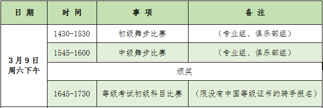 各参赛者请于赛前1天(3月8日)到赛区报到,承办单位东莞金伯乐马术学府马房联系人: