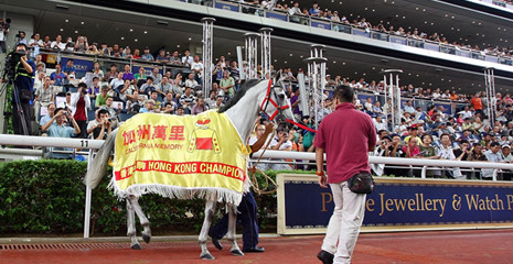 香港赛马会6月14日在沙田马场为不久前退役的“加州万里”举行荣休欢送仪式。“加州万里”是历来唯一能够连胜两届香港杯(2000米一级赛)的赛驹,这匹灰马将前赴澳洲展开新生活,在世界著名的Living Legends牧场颐养天年。