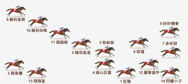 “速势走位图”会显示马匹在赛事早段稳定走势后的预计走位。透过“速势走位图”,大家会知道哪一驹有机会在弯位被顶在外叠,因而较其他马走蚀脚程,亦可知道某些马匹有机会受惠于该场的赛事步速及形势。