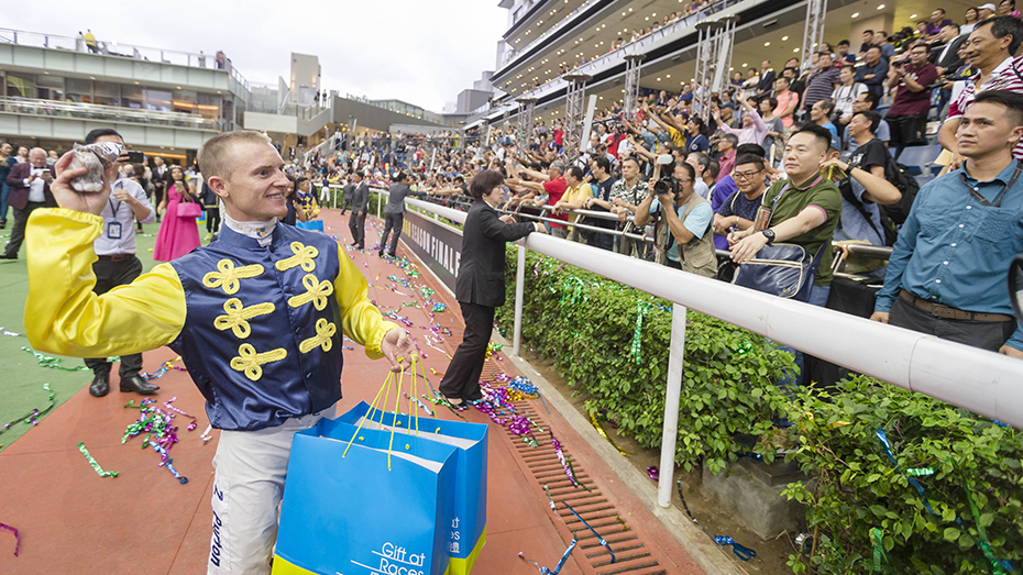 赛后,骑师给马迷送礼道别,感谢一年来的支持,并相约下季再见。