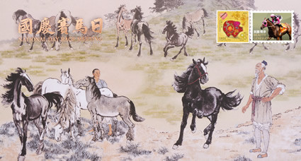 为庆祝2019年国庆赛马日,香港赛马会特别邀请徐悲鸿艺术委员会以国画大师徐悲鸿先生名作《九方皋》为蓝本,糅合其多幅画作的精粹,包括《六骏图》及《奔马图》,设计出《九方皋相马图》,描绘深受伯乐赏识的九方皋正在专注地相马。主题精品于网店优先预售!