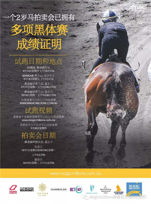 据第一赛马网获悉 10月9、10日,神奇百万黄金海岸2岁在训马拍卖会将开槌,这是广大马主们今年最后的购买2016年出生赛驹的机会。所购马匹,可在澳大利亚,参加总值接近6000万人民币神奇百万系列赛事;在中国,参加总奖金290万人民币在玉龙赛马会举行的神奇百万系列赛事,即总奖金100万元人民币的神奇百万杯两岁经典赛(2016年出生),及6场总奖金分别为10万元的神奇百万杯两岁经典赛预选赛。