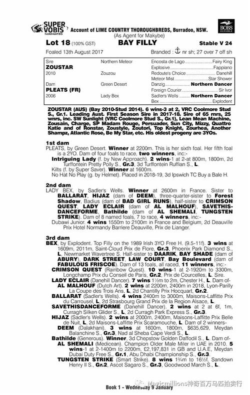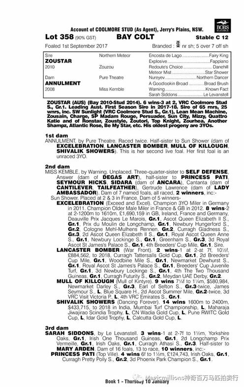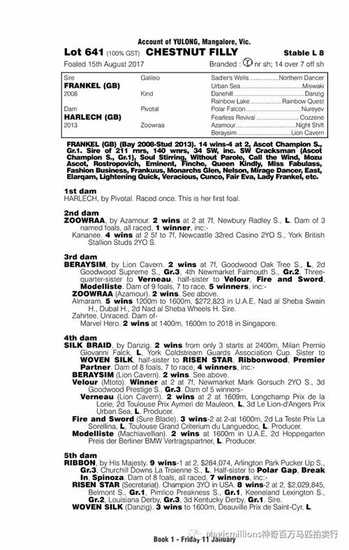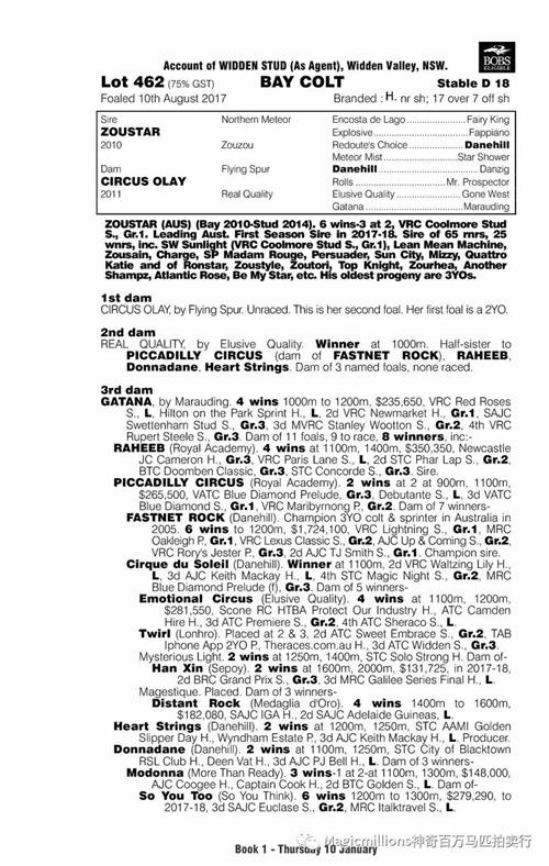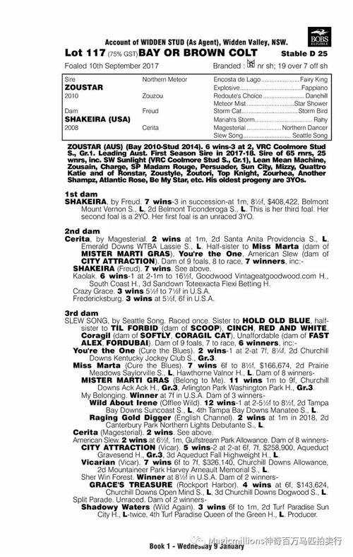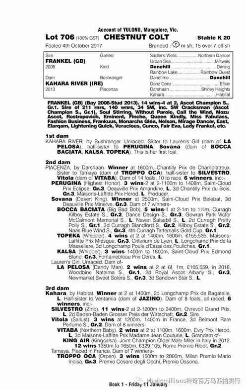 据第一赛马网获悉 2019年如期而至,神奇百万2019年的首场重量级拍卖会黄金海岸周岁马拍卖会也将于2019年1月9日、10日、11日、12日、13日及15日隆重举行。其中1月9-13日共有1122匹周岁马参与竞拍,1月15日举行的是黄金海岸周岁马及赛马拍卖会。日前,2019年黄金海岸周岁马拍卖会目录已经上线,我们也将会陆续介绍一些优质拍卖会马匹。今天介绍欧美及澳大利亚炙手可热种公马子嗣。