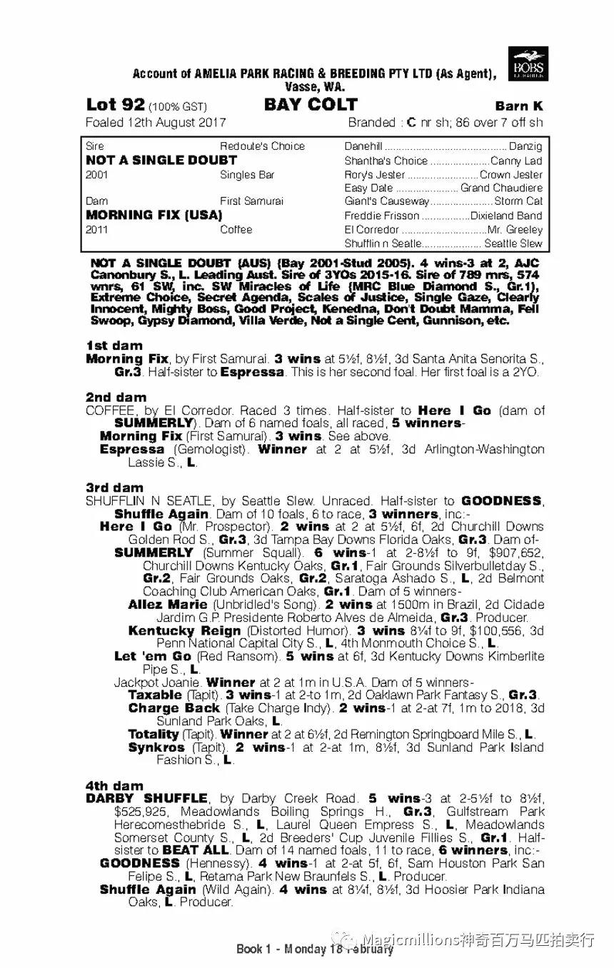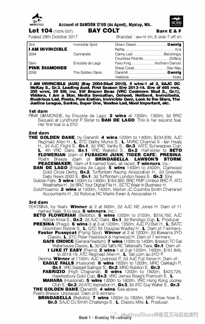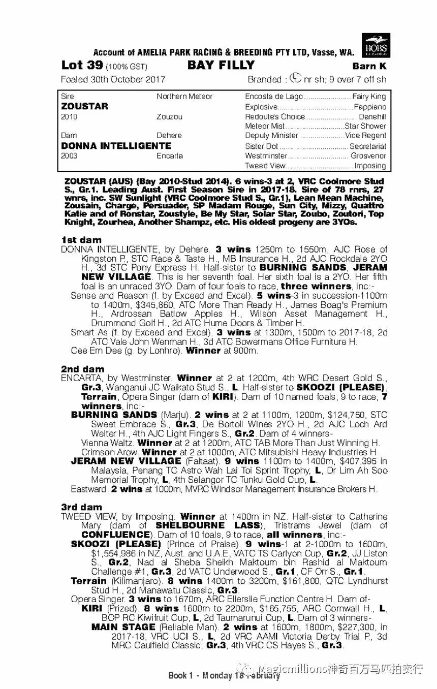 据第一赛马网获悉 2月18日至19日,2019年澳大利亚神奇百万柏斯周岁马拍卖会即将举行。主办方近日公布了此拍卖会的在线目录,为马友推介澳大利亚炙手可热种公马子??。