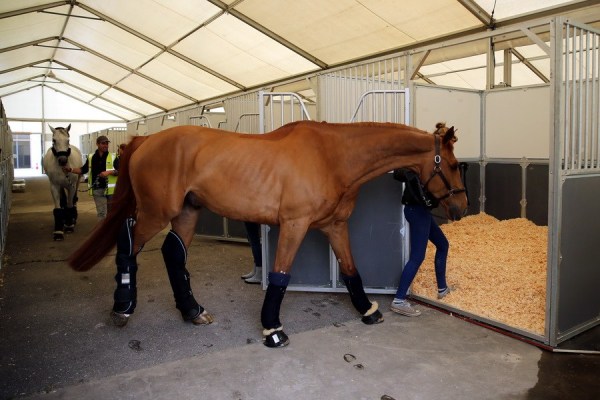 而与此同时,由赛事方今年特意量身打造精心制作的运马车已经提前在机场候命。所有马匹结束机场检验后立即被护送上这些专用的马车,按照事先已勘察过的、周边环境符合欧盟标准的指定路线前往赛场,全程秩序井然。