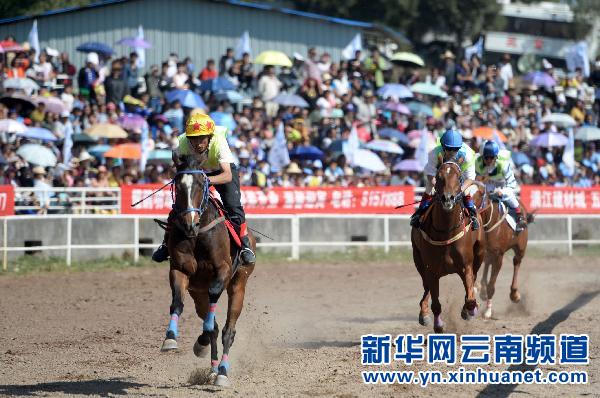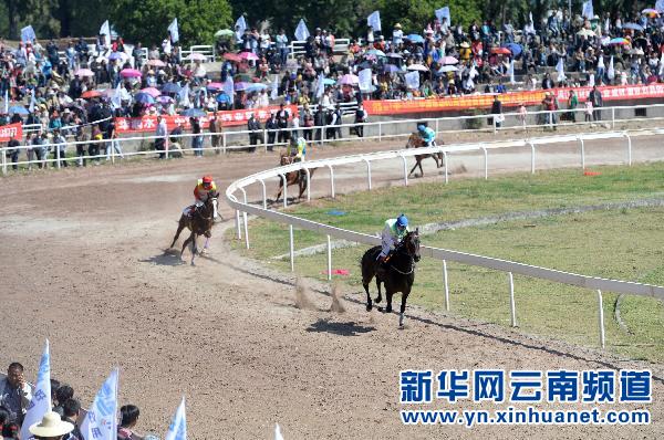 5月3日,骑手在混合组2000米速度赛马比赛中。 当日,2015年云南大理三月街民族节赛马大会开赛。