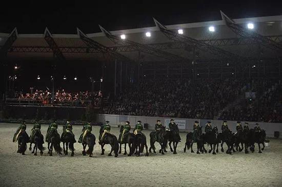亚琛马术节之所以享誉世界,不仅仅因为这里有汇聚了顶级高手的比赛,更因为这里有不可错过的马术表演。当地时间29日晚上8点30分,“马与交响乐“演出在德意志银行体育场正式开始。可容纳5100名观众的体育场内坐无虚席,两边过道和站立观众台上都挤满了前来观看演出的人们。天空飘起了细雨,气温骤然降低,但是随时一幕幕精采的表演和一曲曲熟悉的交响乐,现场观众仿佛忘记了天气带来的困扰,只沉醉在这场视听盛宴中。