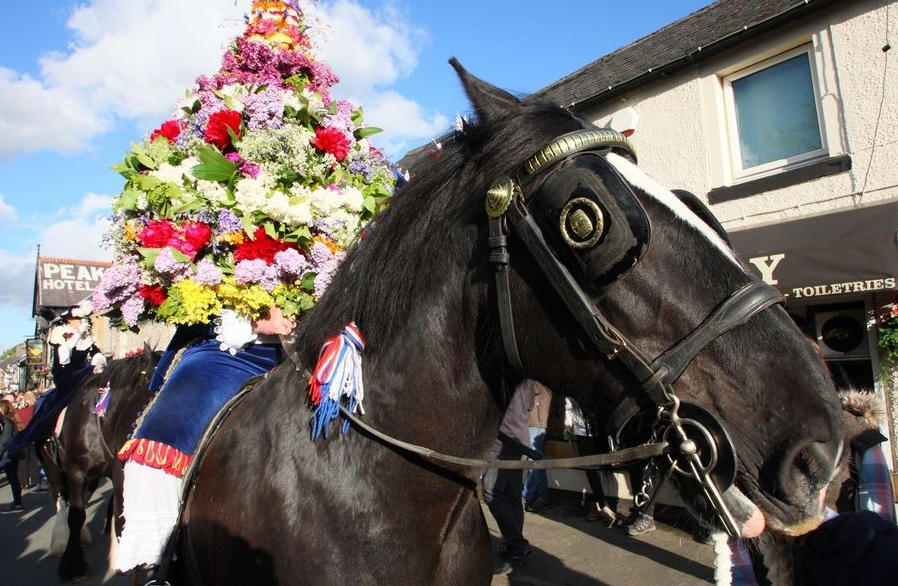 当地时间2015年5月29日,英国德比郡,一年一度的橡树苹果日(Oak Apple Day)举行。加兰国王的表演者腰部以上完全被鲜花覆盖,在指引下骑马游街。据悉,橡树苹果日在每年的5月29日举行,为了纪念英国国王查尔斯二世对英国君主制的复辟做出的贡献。(图片来源:Sipa Photo)