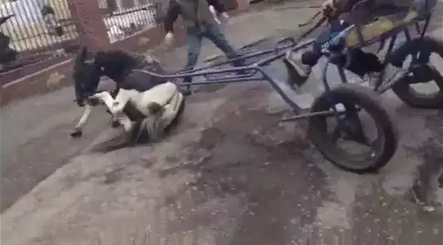 据英国《每日邮报》6月16日报道,近日,一则视频显示在英国38岁的比利·威尔逊(Billy Wilson)多次残忍的抽打一匹马使其前进,可是马儿不堪折磨,跌倒在地上,他32岁的朋友马克·沃克(Mark Walker)寻找到一条绳子准备拖着马儿前进。为此,他们二人均被告上法庭,被判有罪。