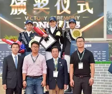图为精英赛第二轮颁奖(从左往右)中马国际马术运动发展(北京)有限公司总经理王鼎先生,中国马术协会外事及竞赛主管范珩先生,国际马联官方裁判平山一哉先生,中马国际马术运动发展(北京)有限公司副总经理周卫国先生