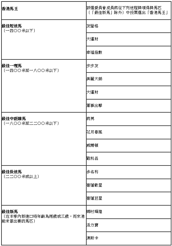 冠军人马奖评选委员会6月24日公布,评选委员会决定颁发终身成就奖予“雄心威龙”以及“加州万里”,以表彰牠们对香港赛马的杰出贡献。2014至2015年度香港赛马会冠军人马奖各奖项的候选马匹名单如下: