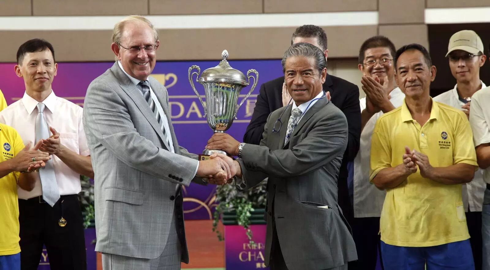告东尼马房荣获2014/15年度“最安全及整洁马房奖”,香港赛马会赛事执行部总监暨职业安全委员会主席(赛事执行部及赛马培训发展委员会)黎达理6月21日在沙田马场马匹亮相圈将奖座颁予练马师告东尼及其马房员工。