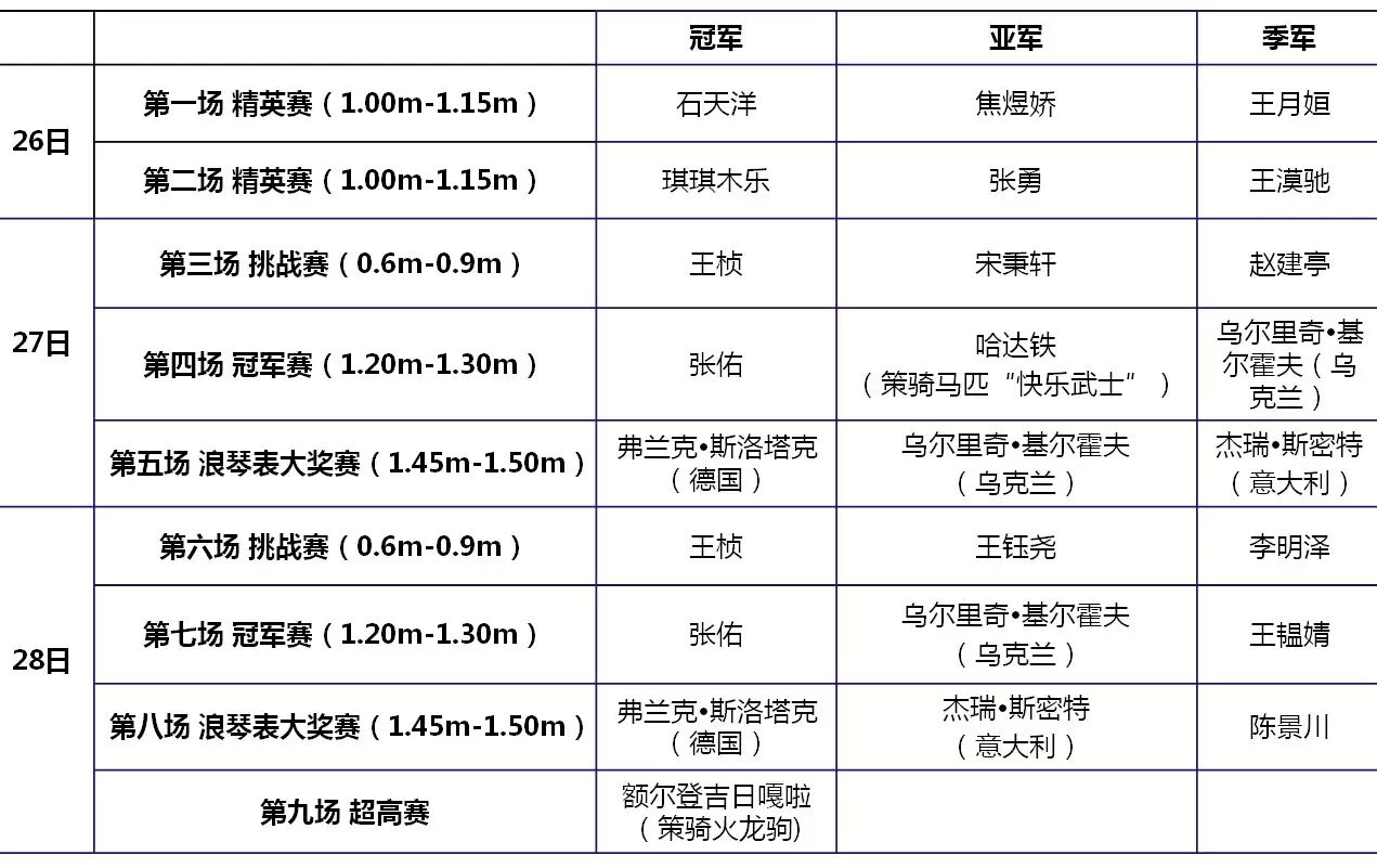 6月28日,2015浪琴表中国马术巡回赛北京站的比赛进入到第三个比赛日,这也是本站比赛的最后一天。值得一提的是,第二日的三个不同级别赛事冠军头衔获得者昨天依然再度夺魁,用实力说话,稳坐头把交椅。中巡赛北京站三日赛果如下: