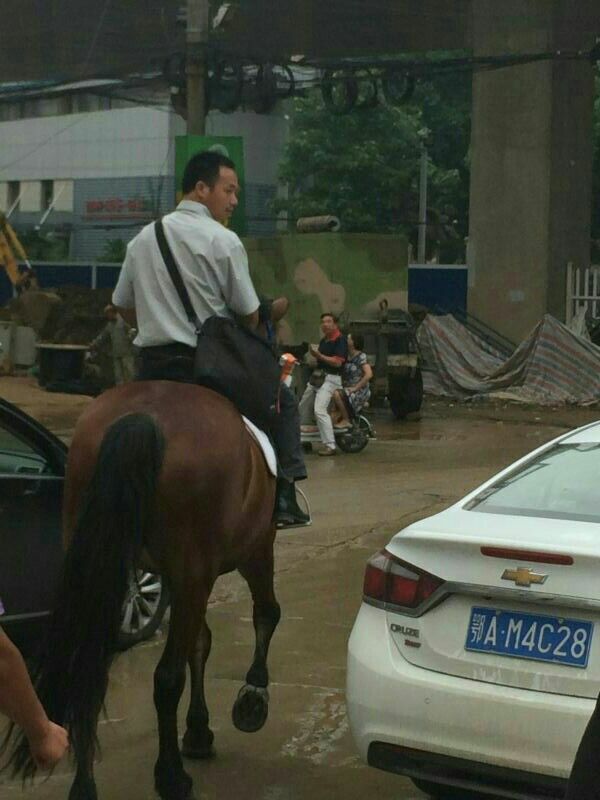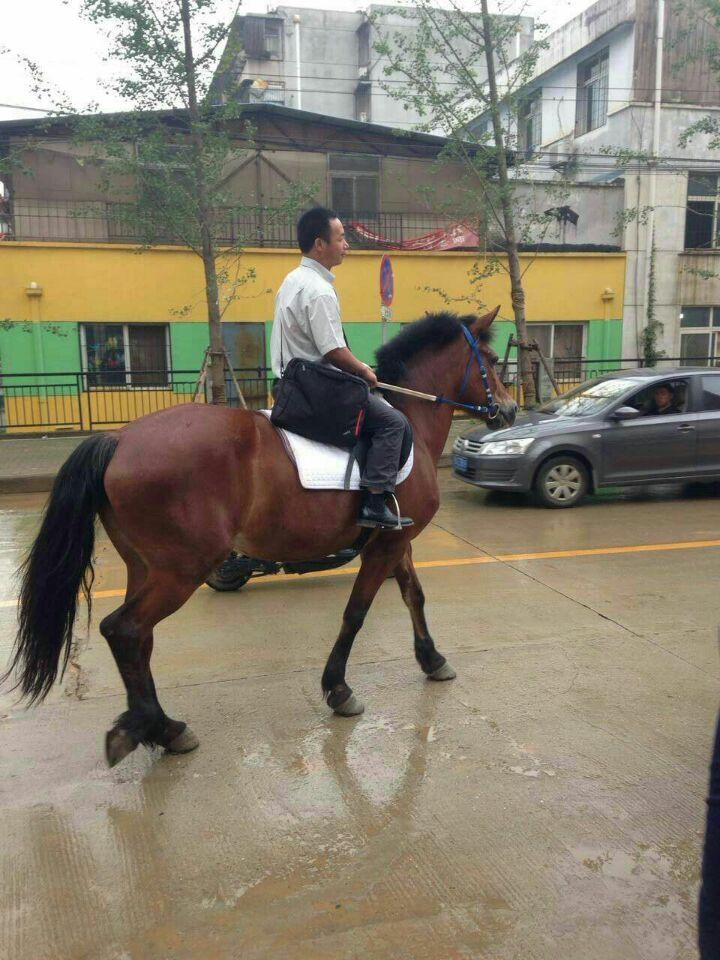 网友报料,武汉的雄楚大道竟然有人骑马上班!据当事人讲述:雄楚大道太堵了,机动车在高峰基本动都动不了,自己天天迟到,于是放弃私家车,而自己又是某马术俱乐部的成员,于是突发奇想骑马匹上班。