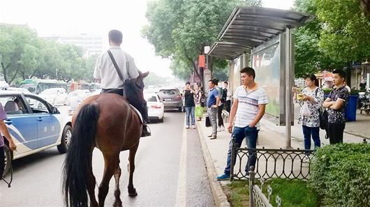 昨日上午9时许,网友“小飞侠-jerry”发了一条微博:“雄楚大街惊现骑马者!有图有真相!”网友“米三天”也发布微博:“蜀黍,就是它,堵了一个小时,发现源头就是它!这样真的可以吗?”