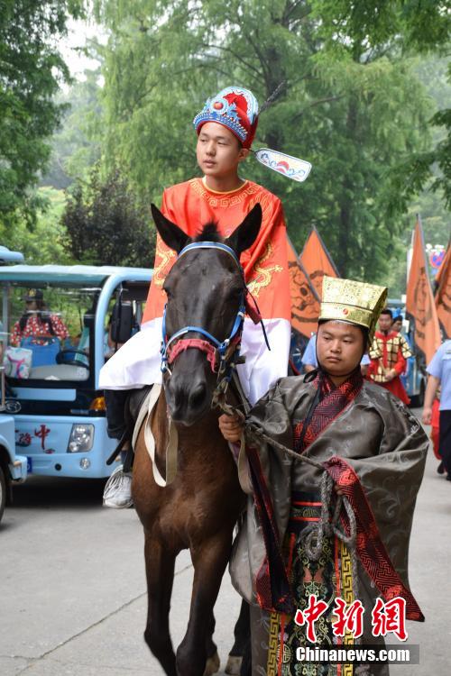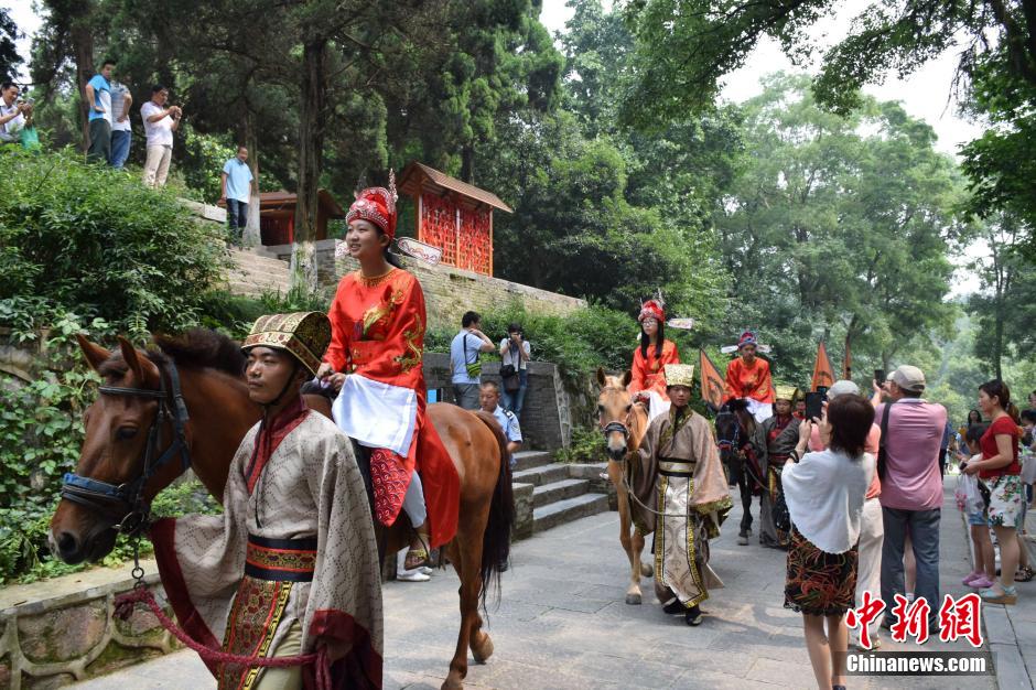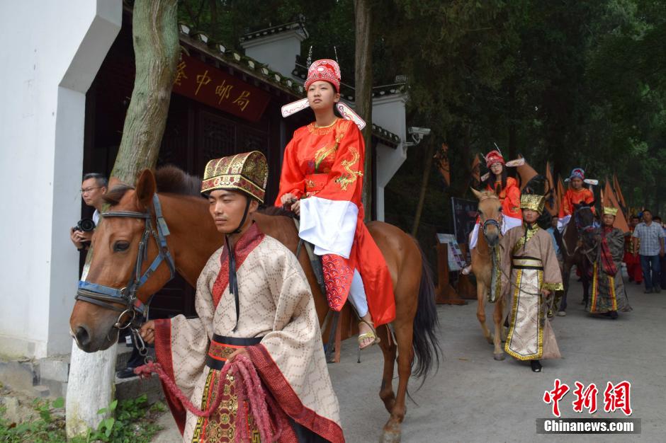 7月9日,古隆中状元季特惠学生旅游节暨三国国际动漫旅游节在湖北襄阳启动。湖北省2015高考文科状元陈凤竹,理科状元刘世豪,榜眼吴慧怡头戴状元帽,身着状元服饰骑马游古隆中,引起游客围观。