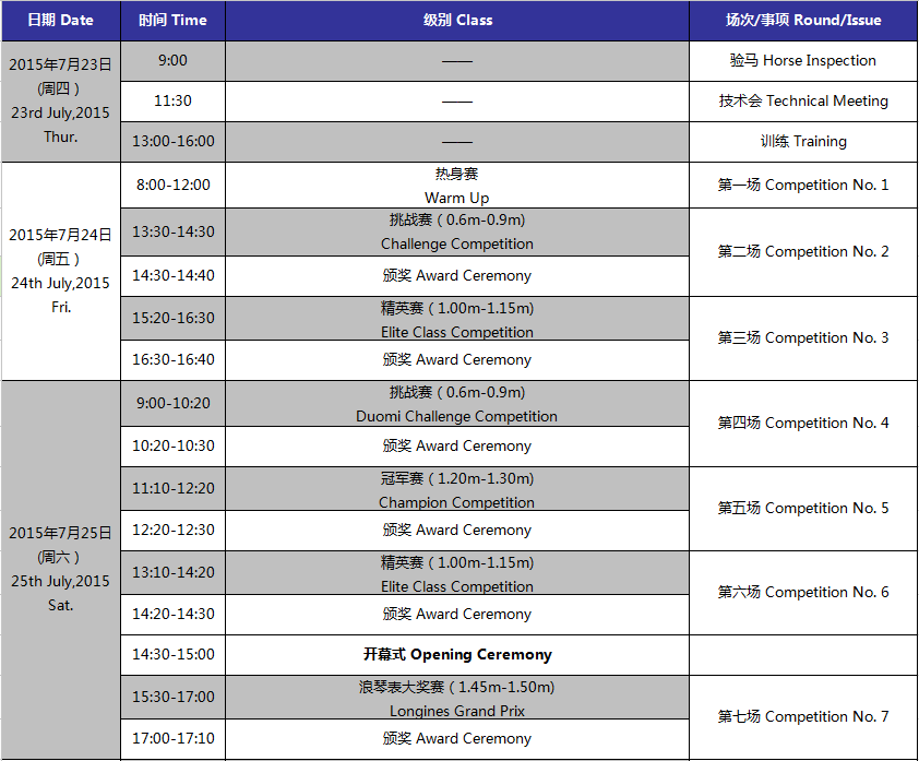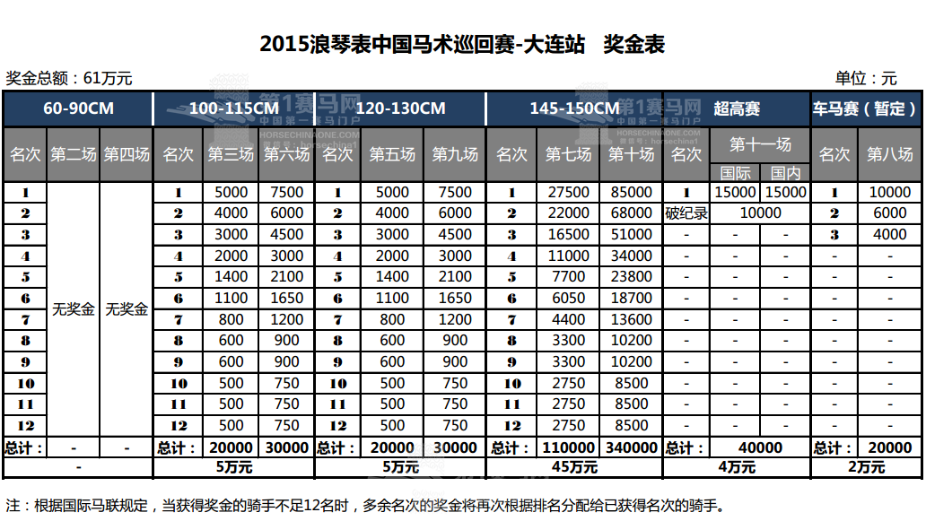 马儿从世界各地纷至沓来,共饮黄浦江水,踏上万里长城。现在,哒哒的马蹄声正涌向海边。2015年浪琴表中国马术巡回赛大连站将于7月24-26日在东港商务区音乐喷泉广场国际游艇港前举行,本次赛事共设浪琴表大奖赛(145-150cm)、东风日产冠军赛(120-130cm)、国域无疆传媒精英赛(100-115cm)、良运集团挑战赛(60-90cm)、世合集团超高赛(150cm以上),总奖金为59万元。经统计,大连站共有154对人马组合报名。在所有选手中,共有14名世界顶尖马术选手,他们中不乏奥运冠军和世锦赛冠军。来自德国的基尔霍夫、斯洛塔克两位奥运冠军,意大利的世界冠军斯密特以及香港的林立信、梁巧玲等一批马术名将的身影将出现在大连站。