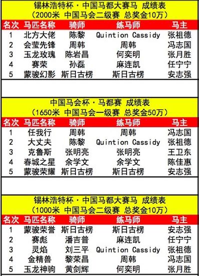在备受关注的“中国马会杯·马都赛”马会一级赛中,中国自主繁育的赛马“任我行”以1分58秒994的成绩勇夺“中国马会杯·马都赛”1650米冠军,“大丈夫”和“克鲁斯”以1分59秒980和2分01秒062的成绩分获第二名和第三名。同时进行的还有“锡林浩特杯·中国马都大赛马”两场马会二级赛,最终,“北方大佬”、“会莹先锋”和“玉龙玫瑰”包揽2000米平磅赛前三甲,“蒙骏荣誉”、“赛彪”和“灵焰”分获1000米平磅赛的冠亚季军。