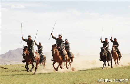 内蒙古阴山脚下有一群年轻人每天与马做伴,驰骋在茫茫草原,维护着祖国边疆的安宁。他们就是在新时代履行着忠诚的古老兵种——骑兵。健壮的军马、威武的骑士,在阴山脚下卷起滚滚黄尘。这就是内蒙古军区某骑兵营,该营是内蒙古全军仅有的两支成建制骑兵部队之一。