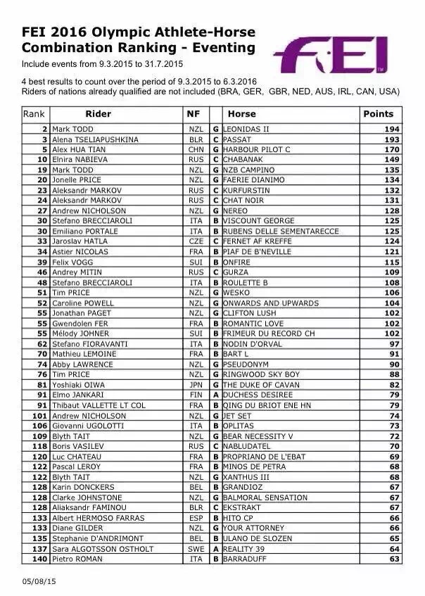 里约奥运将原来75名骑手和马匹组合参赛减少至65名,其中团体40名(10支国家队),个人25名。东道主巴西占了4个个人名额,剩余个人名额只有21个。这就意味着各国骑手要瓜分21个个人名额,以争取进军里约。
