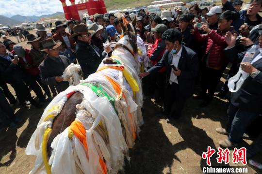比赛结束,当地民众手持哈达追逐在获得冠军的马匹后面,将哈达披在马身上以此送上祝贺,直至整个马背都覆满哈达。