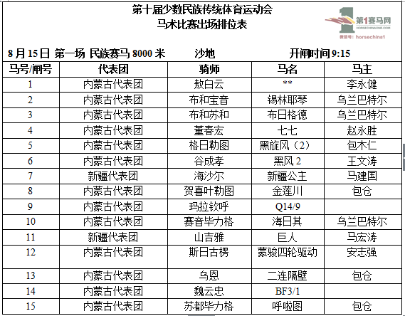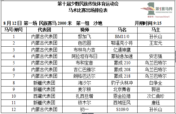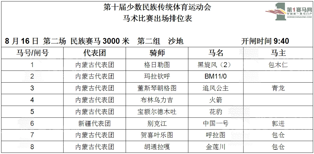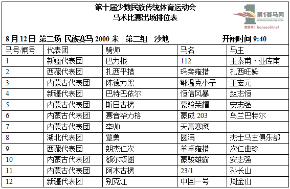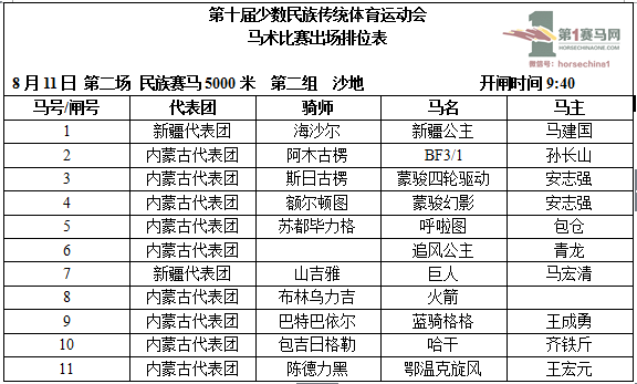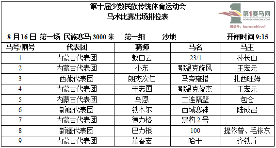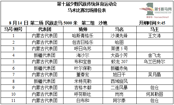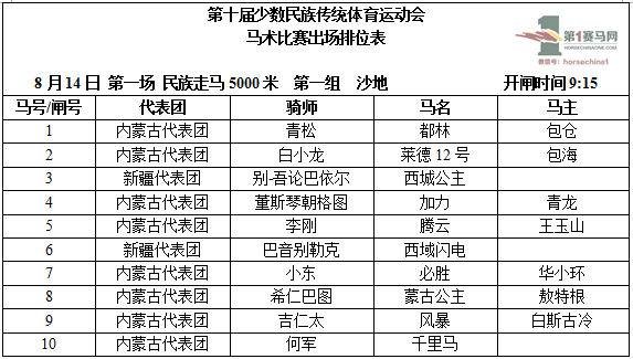 第十届全国少数民族体育运动会马术项目的比赛今日继续进行。今天继续角逐的是走马3000米和民族赛马5000米的比赛。以下是今日及未来几天赛事的排位表: