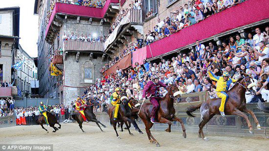 锡耶纳赛马有800多年的历史,观众不仅能领略到观看的趣味,还能感受到比赛的紧张激烈。该地赛马活动一年举办两次,这些马匹代表了意大利不同的地区。活动本身时长仅有1分15秒,但其准备和庆祝工作要花费3天的时间。