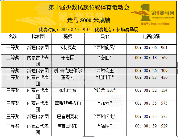 上午9:15,民运会走马5000米在内蒙古鄂尔多斯伊金霍洛旗赛马场激情开战。本场参赛代表队马匹及骑师被分成两组进行比赛,最终,新疆代表队米特克勒策骑“西域旋风”以00:08:06:961的好成绩卫冕冠军,内蒙古代表队于志国伙拍“必胜”以00:08:18:569的成绩紧随其后,第三名由“西域公主”在骑师别·吾龙巴依尔(新疆代表队)胯下获得,成绩是00:08:26:309。