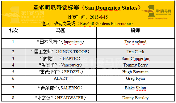 第一赛马网澳洲报道:今日,圣多明尼哥锦标赛(San Domenico Stakes)在澳洲悉尼玫瑰岗马场(Rosehill Gardens Racecourse)开战,本场共有8匹赛驹参与角逐,最终,克里斯·沃勒训练的“日本风潮”(Japonisme )以领先半个马位的优势,击败杰拉德赖安马厩的“国王之师”(KING'S TROOP),夺得本场桂冠殊荣,而由库尔摩尔马房及中国杰士马主俱乐部等联合控股的“温哥华”则大热倒炉,仅排第四。